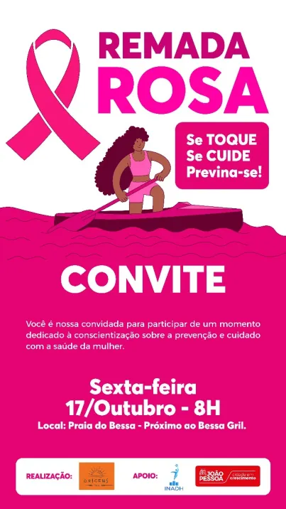 João Pessoa (PB) – Em alusão ao Outubro Rosa, mês dedicado à conscientização sobre a prevenção e o combate ao câncer de mama, será realizada nesta sexta-feira, 17 de outubro, mais uma edição da Remada Rosa, na praia do Bessa.